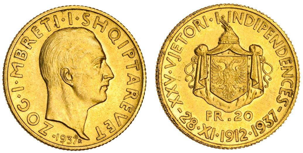 Albania, Zog I (1925-39), AV 20-Franga Ari, 1937, head right, rev. crowned and draped arms over value and Anniversary dates struck to commemorate the 25th Anniversary of Independence (KM 20; F.12), good very fine