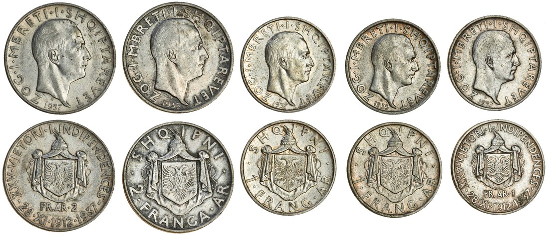 Albania, Zog I (1925-39), 2-Franga (2), 1935, 1937, 25th Anniversary of Indenpendence, 1-Franga (3), 1935, 1937 (2), one celebrating the 25th Anniversary of Independence very fine or better (5)