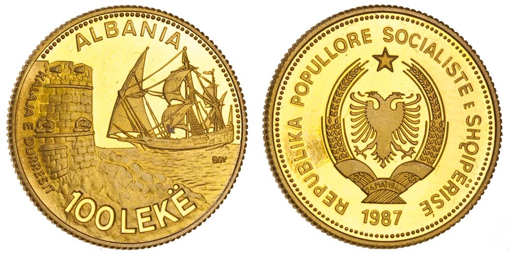 Albania, People's Socialist Republic (1976-92), proof gold 100-Leke, 1987, Seaport of Durazzo, rev. arms (KM 59; F.23), brilliant uncirculated, in box of issue with certificate