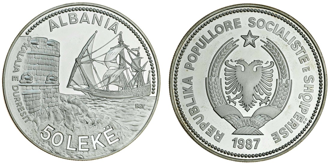 Albania, People's Socialist Republic (1945-90), silver 50-Leke proof, 1987, Seaport of Durazzo (KM 58), brilliant uncirculated, in damaged case of issue