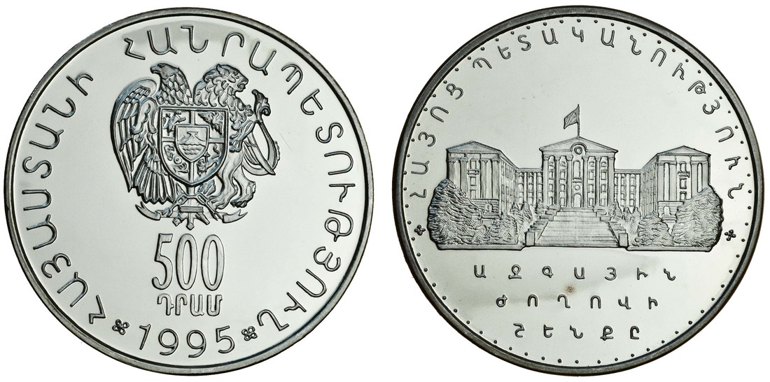 Armenia, proof silver 500-Dram, 1995, National Assembly Building Commemorative, arms, rev. building (KM 65), brilliant uncirculated, in case of issue with compliments card of Armen Khachatryan Chairman of the National Assembly of the Republic of Armenia, a rare commemorative issue with a mintage of only 300