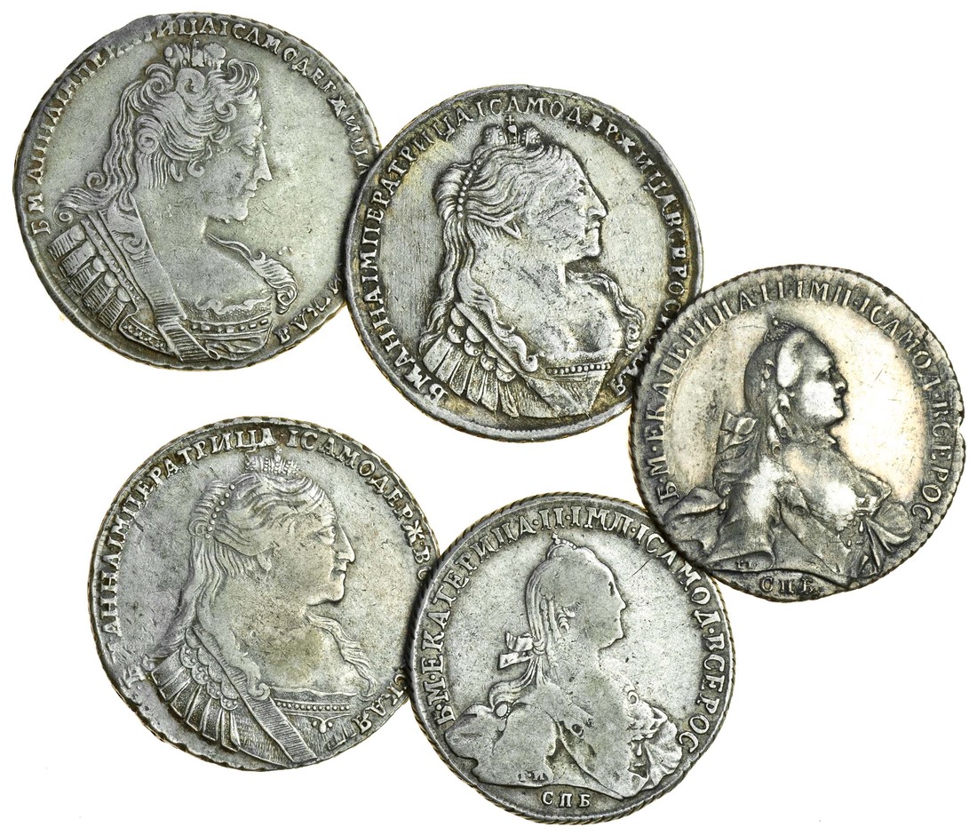 Russia, Anna (1730-40), Roubles (3), 1733, 1734, 1736, Catherine II (1762-96), Roubles (2), 1764, 1775, m.m. St Petersburg (KM 192, 197, 67.2, 67a.2), fine or better (5)