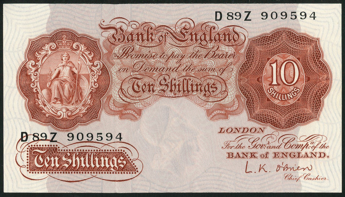 Bank of England, L.K.O'Brien, 10 shillings (2), ND (1955), prefixes D89Z and Z98X, brown, Britannia at left, value at right