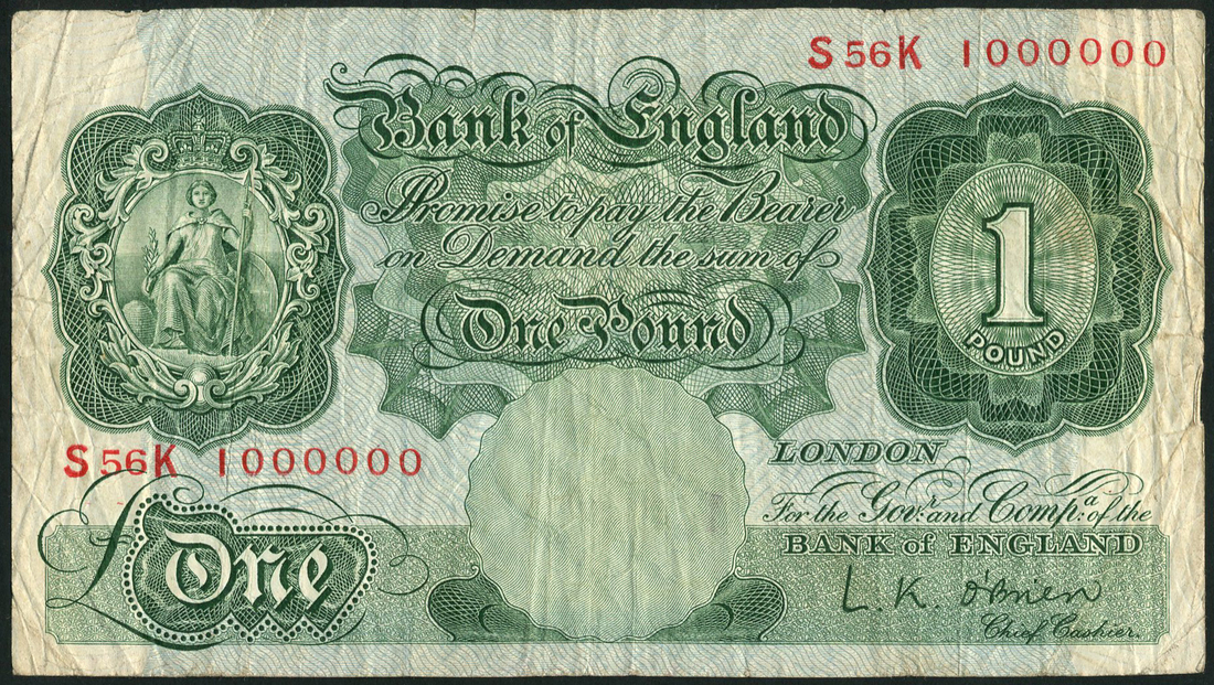 Bank of England, L K O'Brien, £1, ND (1955-60), serial number S56K 1000000, green, Britannia at left bank title top centre, value low left, centre and top right