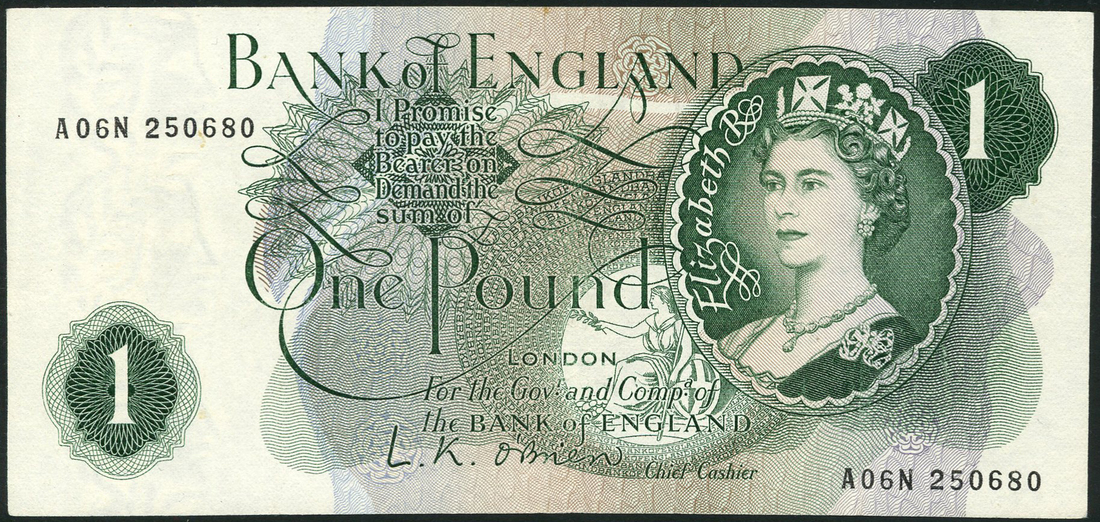 Bank of England, L K O'Brien, £1, ND (1960), serial number A06N 250680, green, bank title top centre, portrait Queen Elizabeth II in ornate circular frame at right, value in tablet low left and top right and at centre