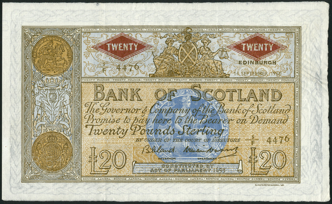 Bank of Scotland, £20, 14 September 1960, serial number 5/F 4476, brown, tan, red and blue, arms at top centre and low left, value at each corner, blue medallion at centre