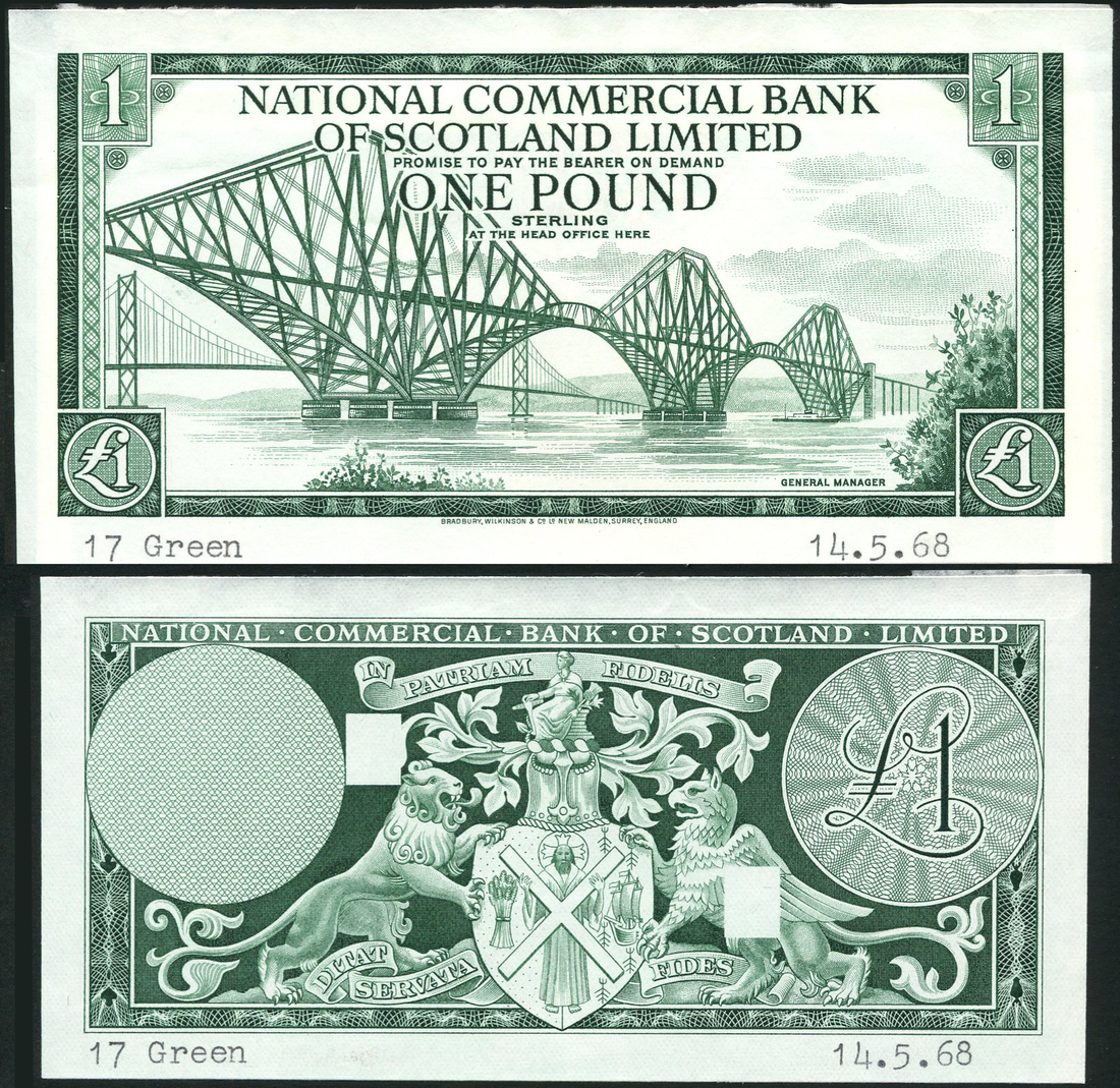 (†) National Commercial Bank of Scotland Limited, a group of progressive proofs for £1, ND (1968) comprising 1. Obverse proof with blue and purple underprint and pattern only; 2. Obverse proof with blue and orange underprint and pattern only; 3. Obverse proof with blue, green, orange and brown underprint and pattern only; 4. Obverse die proof in '17 Green' and typed date '14. 5. 68', Forth Rail Bridge; 5. Reverse die proof in '17 Green' and dated '14. 5. 68', coat of arms