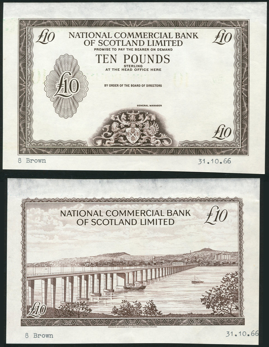 (†) National Commercial Bank of Scotland Limited, obverse and reverse uniface die proofs for a £10, ND (1966), '8 Brown' and typed date '31. 10. 66' in lower margins, obverse complete except for multicoloured underprint, value in guilloche at left, arms at lower centre, reverse complete except for multicoloured underprint, Tay Road Bridge and view of Dundee