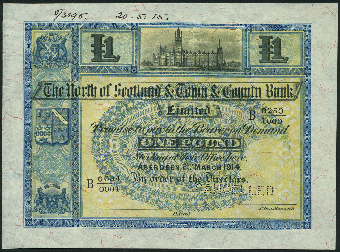 (†) North of Scotland Bank Limited, printer's archival specimen £1, 2 March 1914, serial number run B 0034/0001 to B 0253/1000, "A" size square note; also printer's archival specimen £1, 1 March 1932, serial number run H 0062/0001 to H 0316/1000, "B" size note, both blue on yellow underprint, Marischal College Aberdeen at top centre, value on either side, three coats of arms in panel at left, reverse bank coat of arms, both perforated CANCELLED
