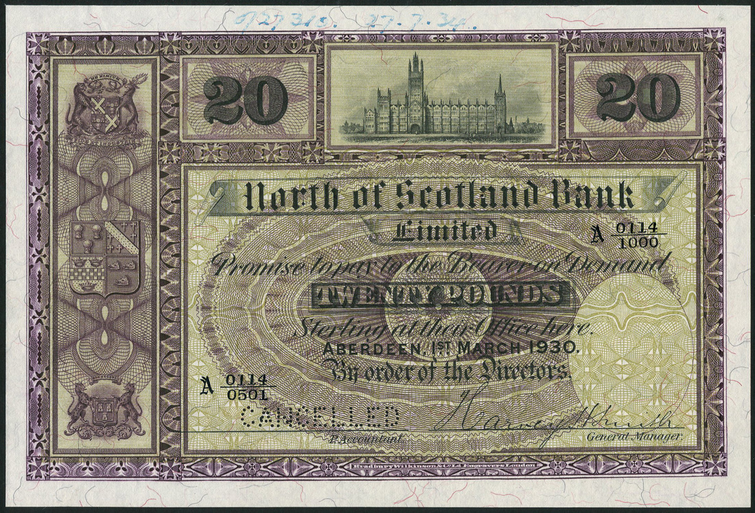 (†) North of Scotland Bank Limited, printer's archival specimen £20, 1 March 1930, serial number run A 0114/0501 to A 0114/1000, purple on olive-green underprint, Marischal College Aberdeen at top centre, value on either side, three coats of arms in panel at left, reverse bank coat of arms, value in guilloches repeated five times, perforated CANCELLED