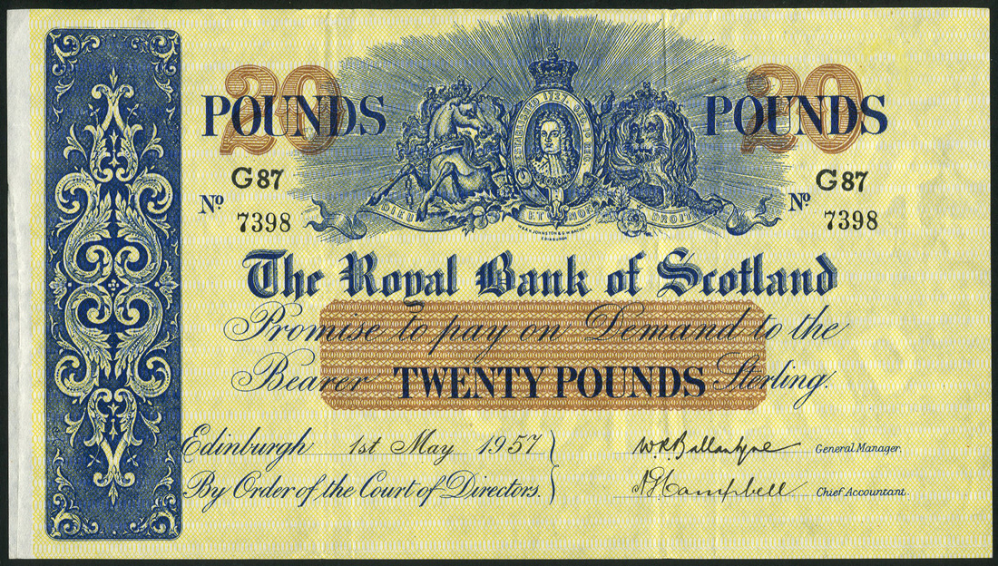 Royal Bank of Scotland, £20, 1 May 1957, serial number G87 7398, uniface, blue on yellow background, portrait George I flanked by lion and unicorn at top centre, ornate panel at left, value in red tablet at centre with bank title above, Ballantyne and Campbell signatures low right