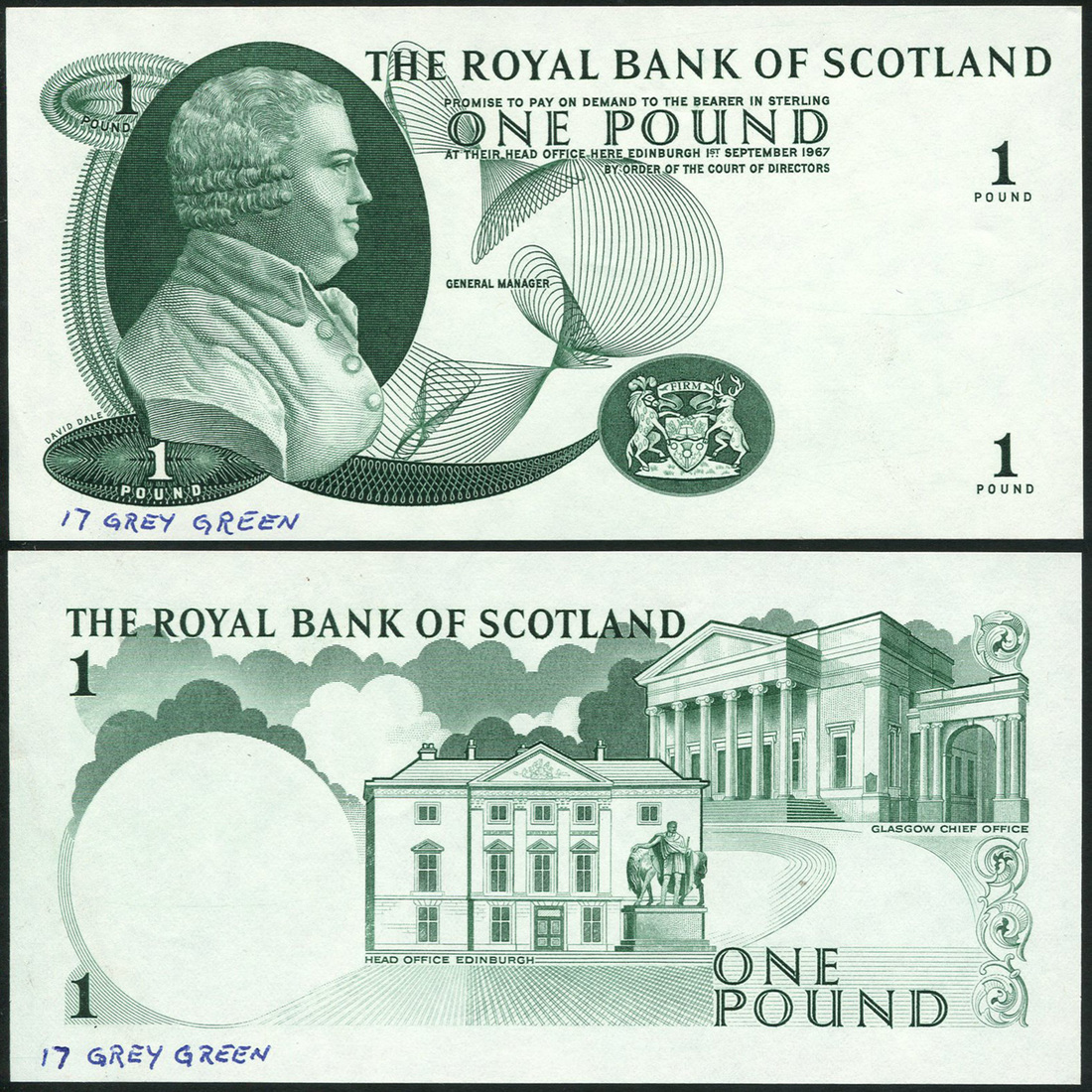 Royal Bank of Scotland, obverse and reverse die proof £1, ND (1967), green print, portrait of David Dale at left, coat of arms at lower right, value in each corner, reverse green, bank office buildings
