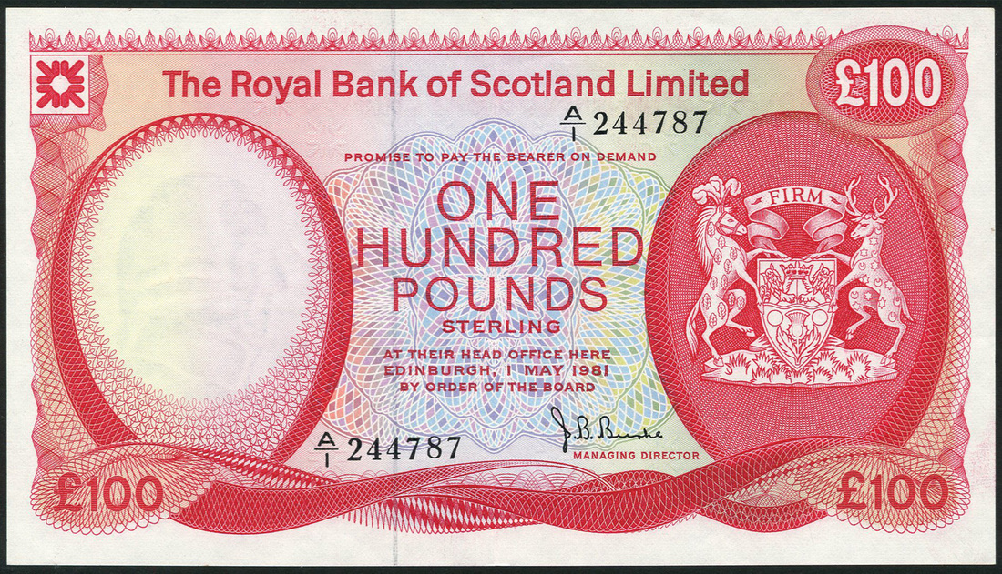 Royal Bank of Scotland Limited, £100, 1 May 1981, serial number A/1 244787, red and multicoloured, arms at right, Burke signature