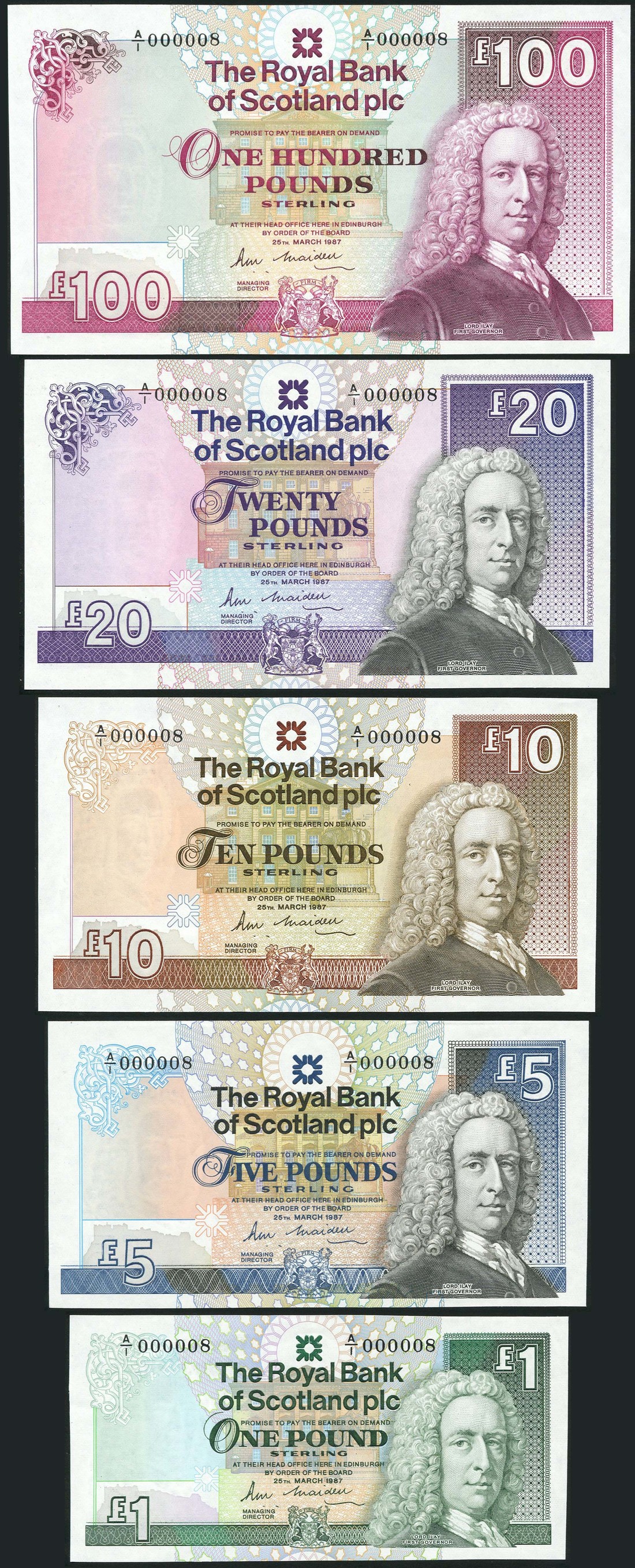 Royal Bank of Scotland plc, a set of the 25 March 1987 series comprising £1,5,10,20 and £100, all serial number A/1 000008, all Lord Ilay at right, arms low centre, value top right and low left, R.M.Maiden signature, various castles, Edinburgh, Culzean, Glamis, Brodick and Balmoral respectively on reverse