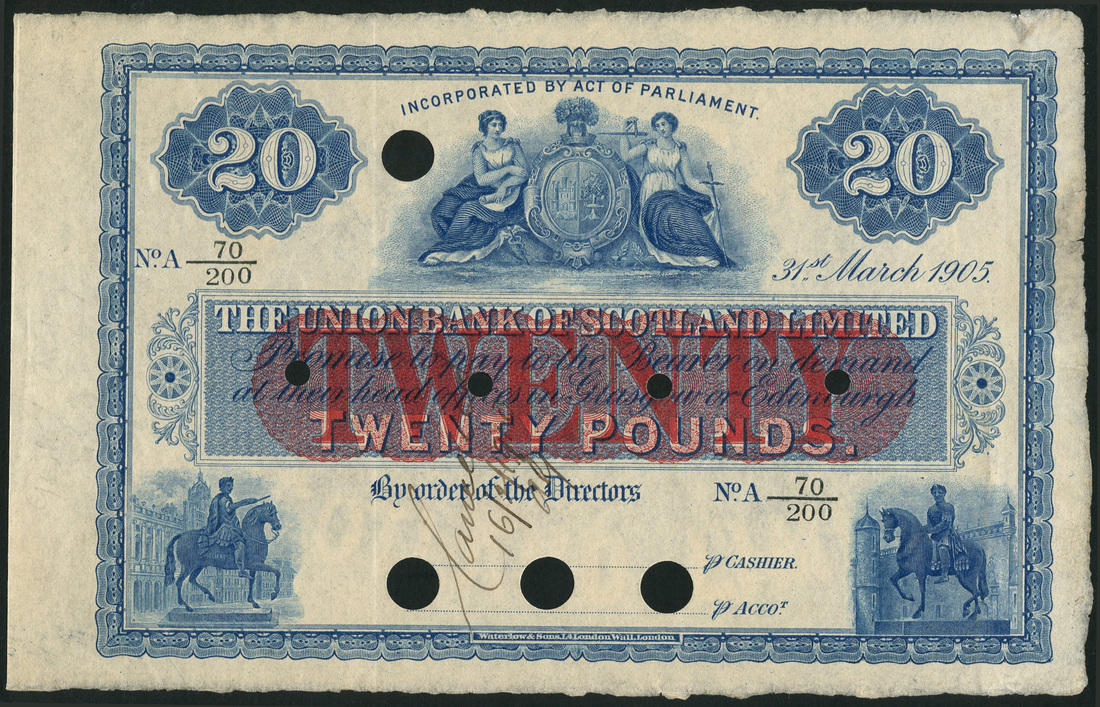 (x) Union Bank of Scotland Limited, specimen £20, 31 March 1905, serial number A 70/200 blue and white, red value panel at centre, arms flanked by allegorical maidens upper centre, equestrian statues of William III at lower left and Charles II at lower right, value top left and right, marked Cancelled in black ink, punch holes, reverse blue and white