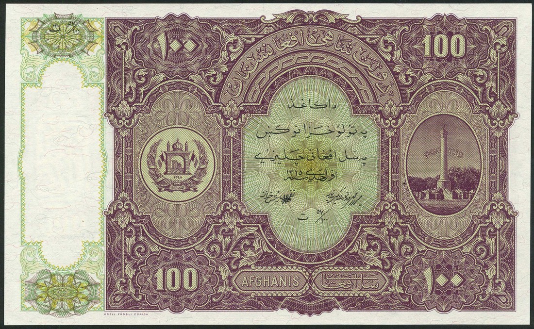 Ministry of Finance, Afghanistan, a set from the 1936 first issue comprising 2, blue, 5, red, 10, brown, 20, red-brown, 50 afghanis, blue and 100 afghanis, purple all with coat of arms and vignette of Independence monument in Kabul