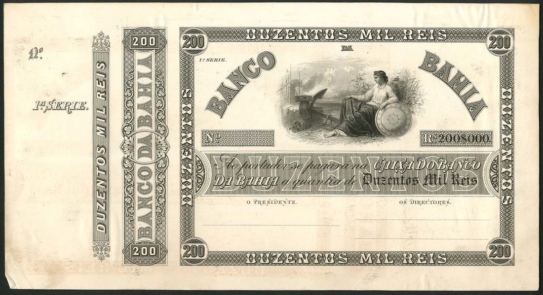 (†) Banco da Bahia, Brazil, die proof on card for 200 mil reis, ND (c.1860), uniface, black on white card, allegorical maiden with shield and anchor at top centre, value at each corner