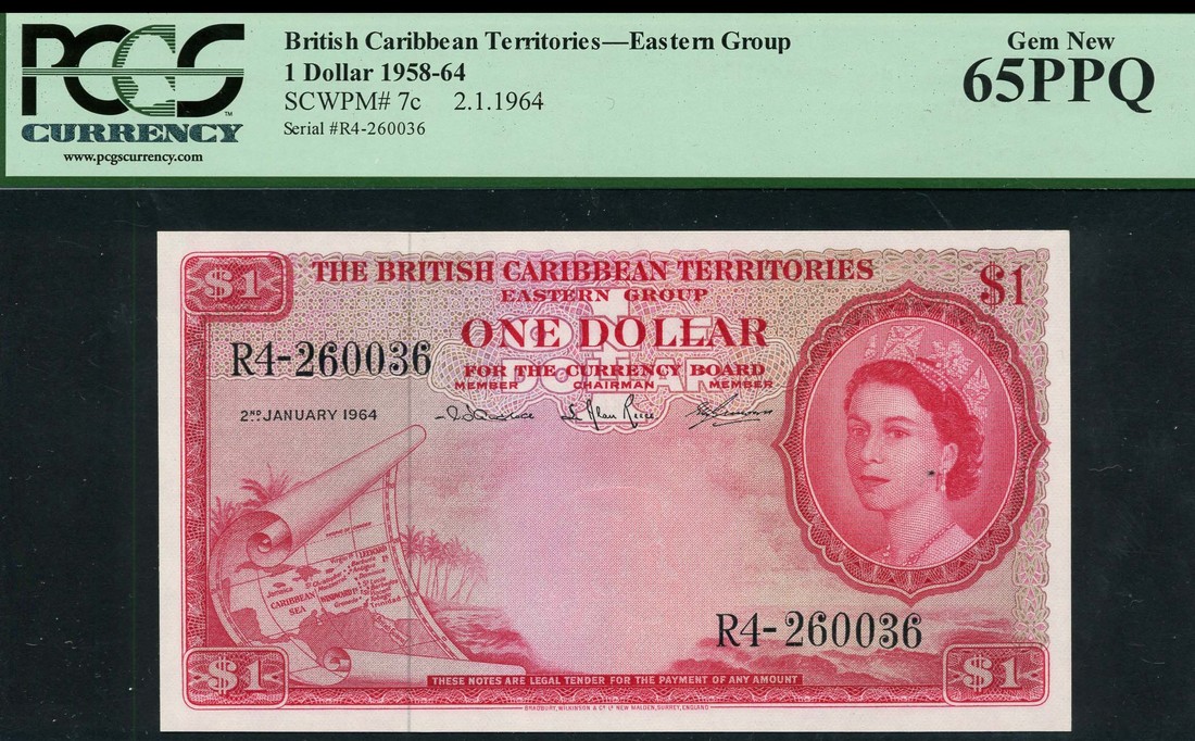 (x) British Caribbean Territories, $1, 2 January 1964, serial number R4-260036, red and mauve, Elizabeth II at right, map at left