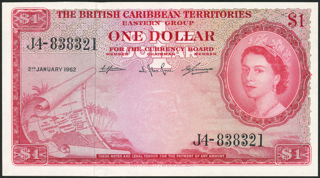British Caribbean Territories, $1 (2), 2 January 1962, serial number J4-838321, 2 January 1964, serial number R4-260044, red, portrait Queen Elizabeth II in ornate circular frame at right, map of Caribbean Sea on scroll at left, palm trees and shoreline in background, reverse, Territories' coats of arms, horses and chariot flanked by dolphins
