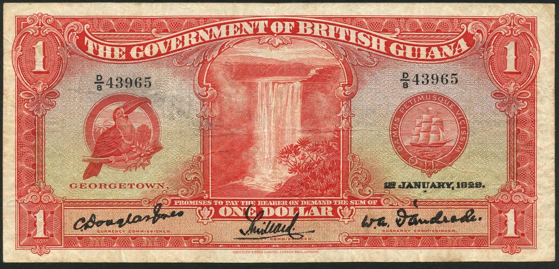 Government of British Guiana, $1, Georgetown, 1 January 1929, serial number D/8 43965, red and pale blue and pale green, toucan at left, ship seal at right, Douglas-Jones, Millard and d'Andrade signatures, reverse red, George V at centre, value at left and right