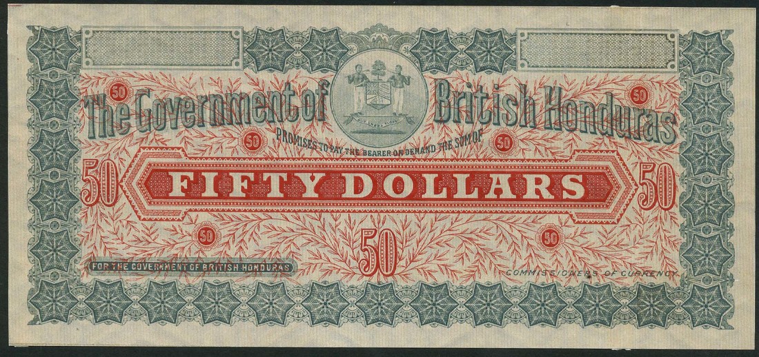 (†) Government of British Honduras, obverse specimen/proof $50, ND (1895), no serial numbers, blue-grey and red, arms at top centre, value at low centre, left and right, and in tablet at centre, no signatures