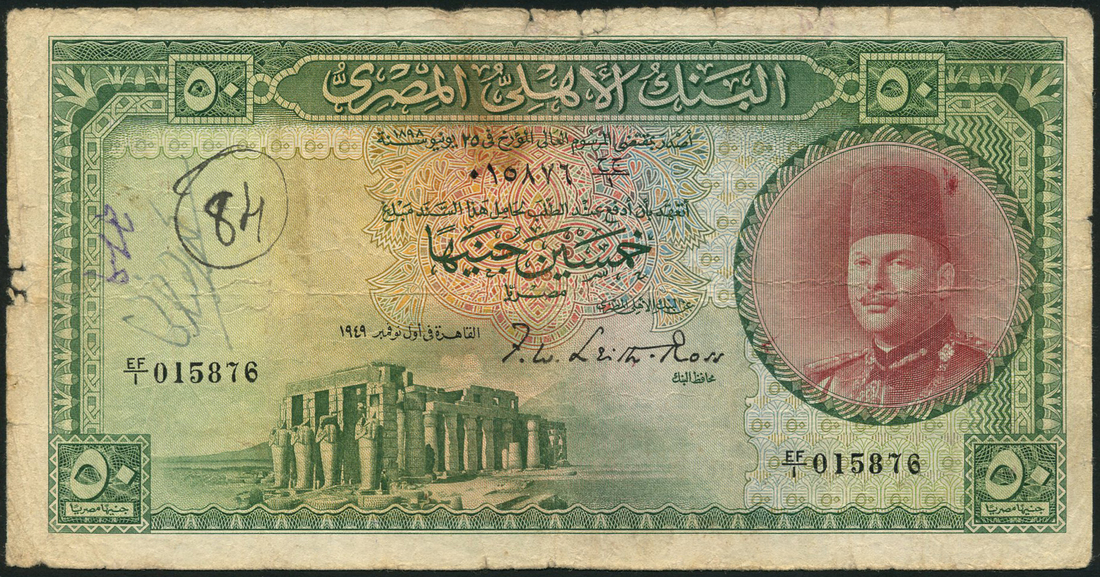 National Bank of Egypt, £50 (2), 1949, 1952, green and red, the ruins at Karnak at left, King Farouk and Leith-Ross signature, Tutankhamen and Saad signature respectively