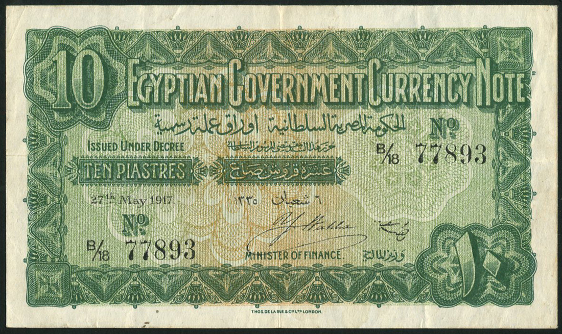 Egyptian Currency Government note, 10 piastres (2), 1917, prefixes A/96 and B/18, green, Wahba signature, reverse blue, the Colossi of Memnon, value at left and right, also 10 piastres (2), brown and lilac, Badawy and Osman signatures