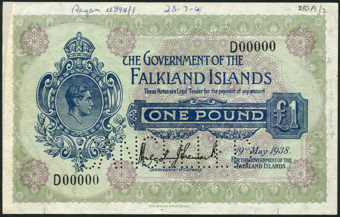 (x) Government of the Falkland Islands, specimen £1, 19 May 1938, serial number D00000, green and lilac, vignette of George VI at left in blue, value in blue tablet at centre, Malcolm John Stewart signature low centre, reverse blue, guilloche pattern, perforated CANCELLED