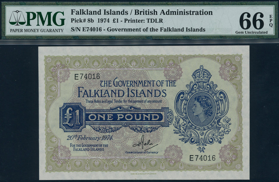 Government of the Falkland Islands, £1, 20 February 1974, serial number E 74016, dark blue, olive green and pale lilac, portrait Queen Elizabeth II in ornate frame at right, bank title top centre, value in tablet at centre, reverse, dark blue guilloche pattern