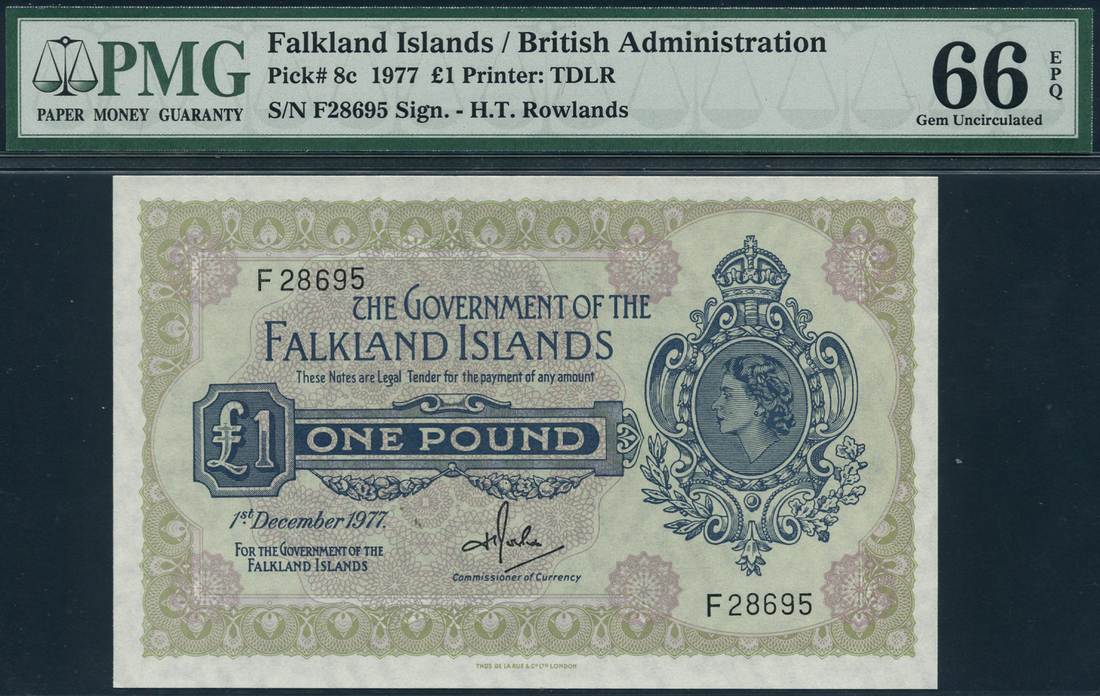Government of the Falkland Islands, £1, 1 December 1977, serial number F 28695, dark blue, olive green and pale lilac, portrait Queen Elizabeth II in ornate frame at right, bank title top centre, value in tablet at centre, reverse, dark blue guilloche pattern