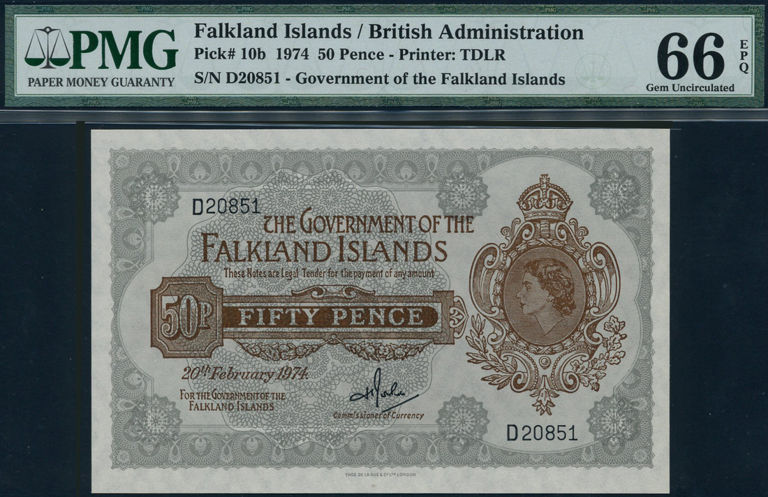 (TBB B215, Pick 10b), in PMG holder number 66, gem uncirculated, EPQ, most of this Falkland Islands series have deceptive low numbers which are not obvious to the collector. This series starts at D 200001 thus this is the No. 851 note. A great opportunity for the low number QEII collector