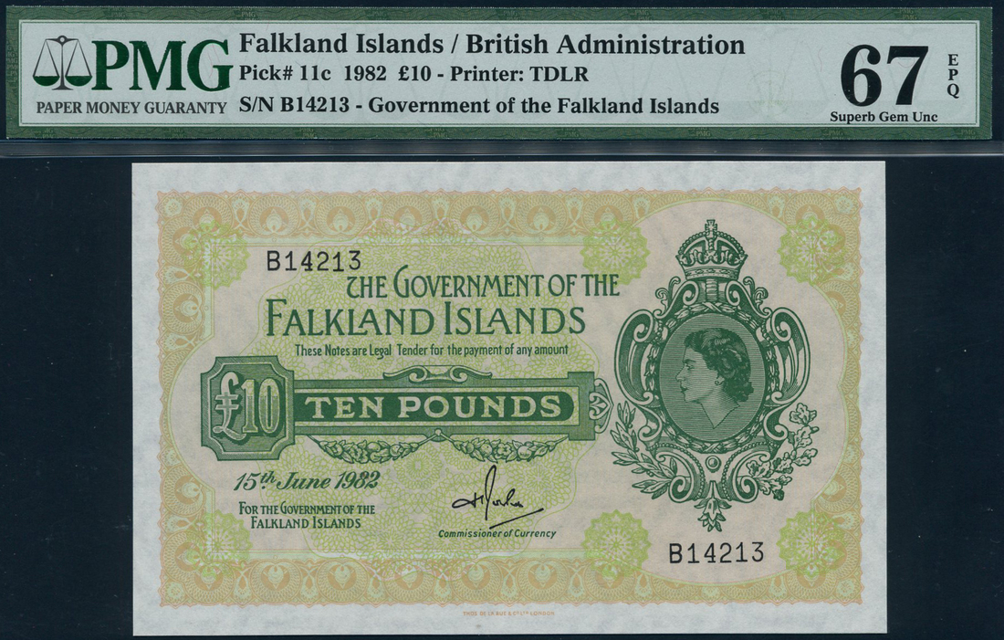 Government of the Falkland Islands, £10, 15 June 1982, serial number B 14213, green on light tan underprint, portrait Queen Elizabeth II in ornate frame at right, bank title top centre, value in tablet at centre, reverse, dark blue guilloche pattern