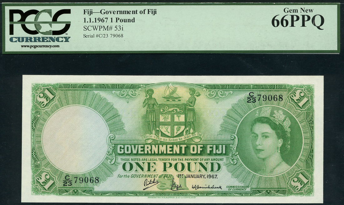 (TBB B330, Pick 53i), in PCGS holder number 66, gem new, PPQ, Fiji £1 notes are long and very rare to find notes without central fold