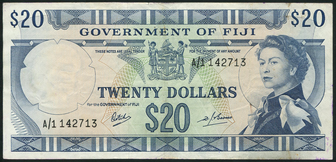 Government of Fiji, $1, $20, ND (1969), serial numbers A/1 655122 and A/1 142713, brown and blue, respectively, both Richie Barnes signature, also, $1, $2, ND (1974), serial numbers A/8 472551 and A/8 622912, brown and green respectively, Barnes Earland signature, all featuring portrait Queen Elizabeth II at right