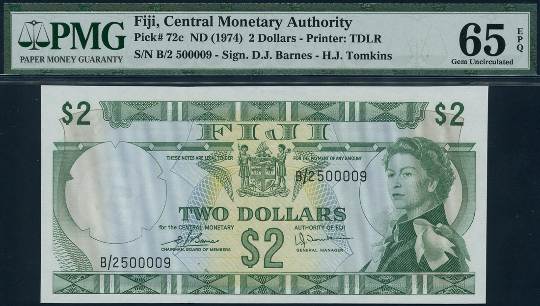 (TBB B403, Pick 72c), in PMG holder number 65, gem uncirculated, EPQ, a very rare low number Fiji note with the Annegoni portrait, this series starts at B/2 500001 thus an extremely low serial number