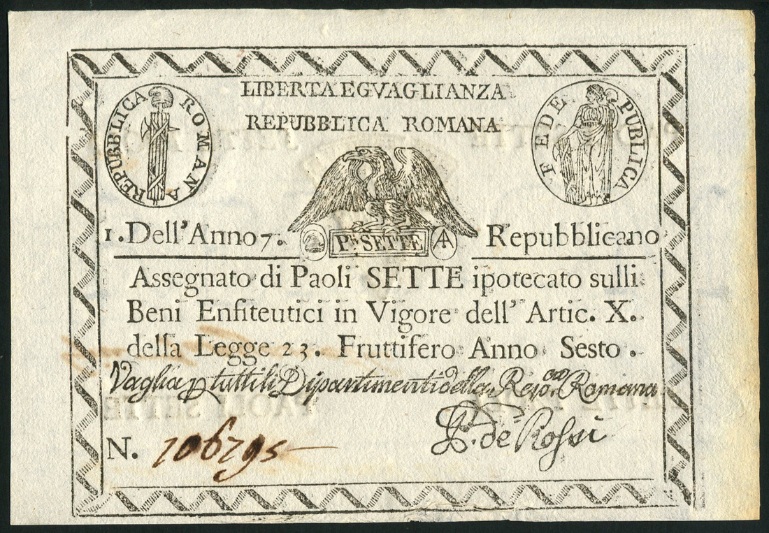 Assignats of the Roman Republic, for 7, 9, 10 paoli, ND (1798), black and white, fasces top left, liberty top right, eagle at centre
