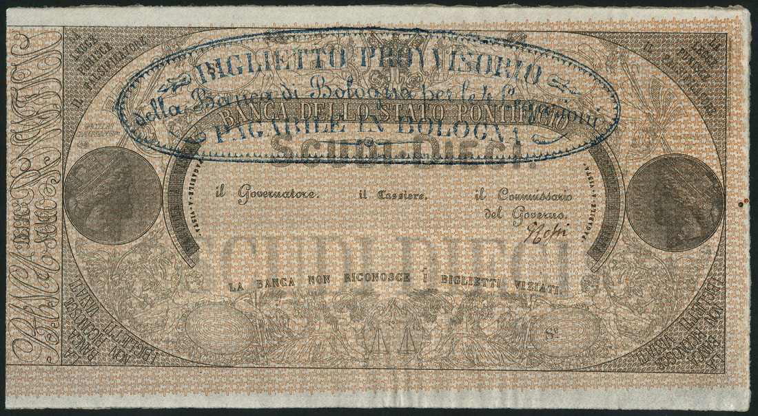 Banca Pontifica Per La 4 Legazioni, 10 scudi, ND (1855), overprint on Banco dello Stato Pontificio issue, orange and brown with blue overprint, vignettes of turreted female heads at left and right, papal arms top centre, value below, reverse brown
