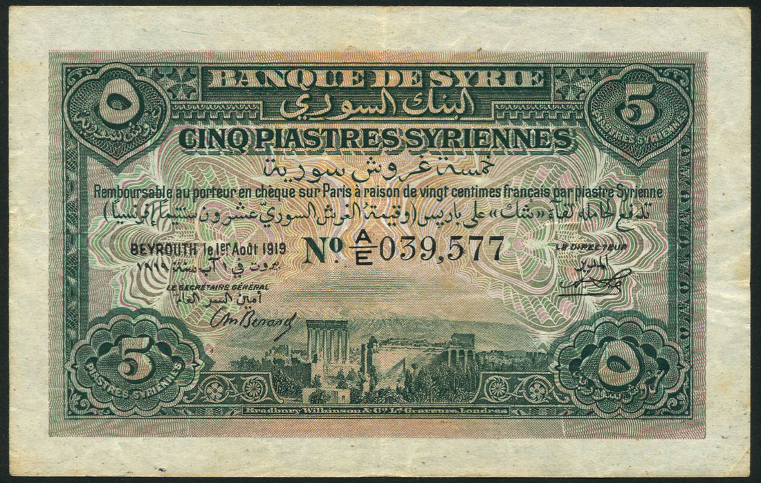 (x) Banque de Syrie, 5 piastres (2), 1 August 1919, serial numbers A/E 039, 577 and A/AE 051,517, dark green on multicolour underprint, ruins of Baalbek at low centre, bank title across top, reverse, blue and mauve geometric pattern, lion's head at centre