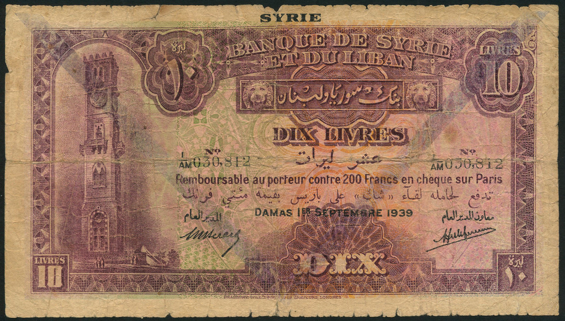 (x) Banque de Syrie et du Liban, Syria, 1 livre (3), 5 livres and 10 livres, all dated 1 September 1939, serial numbers J/U 020,502, J/FB 010,171, J/FB 078,115, green and mauve, two with red double chevron overprint, 5 livres, 1 September 1939, serial number K/BX 030,662, black on multicolour underprint, blue diamond overprint, and 10 livres, 1 September 1939, serial number I/AM 030,812, purple with faint blue chevron overprint