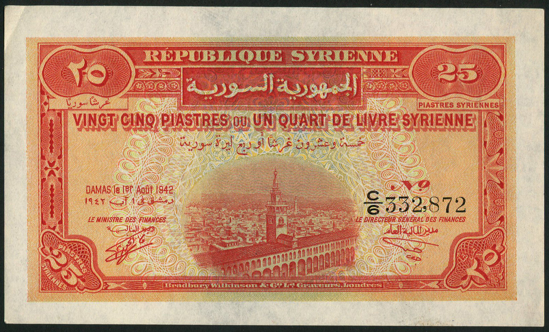 Republique Syrienne, 5 piastres, 1942, olive green, 25 piastres (2), 1942, serial numbers C/6 332,872 and C/6 816,186, red on light orange, 5 piastres, 1944, green on light green, 10 piastres, 1944, brown on light tan underprint,