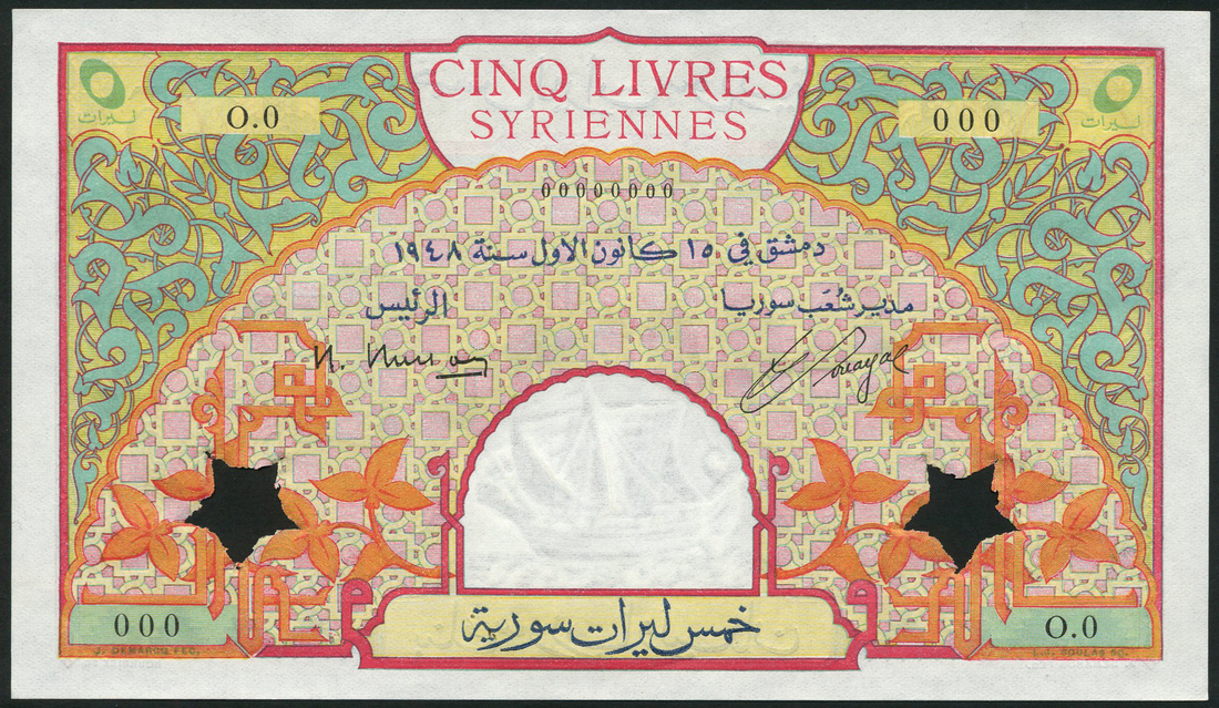 (x) Banque de Syrie et du Liban, specimen 5 livres, 1948, zero serial numbers, blue, green, pink and orange on yellow underprint, ornate scrollwork at upper left and right, stylised flowers low left and right, reverse, Azem Palace in rectangular frame at centre