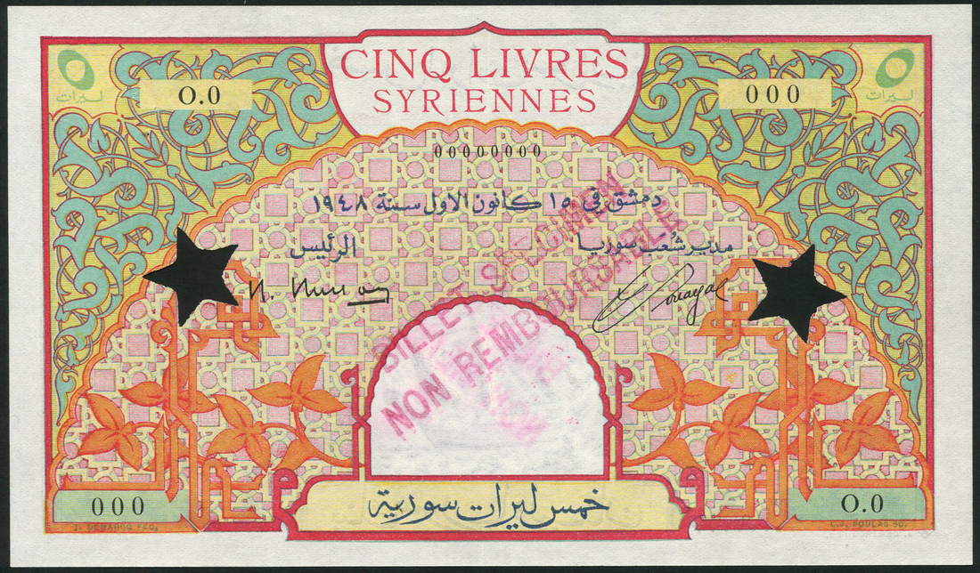Banque de Syrie et du Liban, Syria, specimen 5 Livres, 1948, zero serial numbers, Busson and Souayal signatures, blue-green, pink and orange on yellow underprint, ornate scrollwork at upper left and right, stylised flowers at lower left and right, reverse Azem Palace in rectangular frame at centre, overprinted BILLET SPECIMEN NON REMBOURSABLE in purple on obverse and reverse, stars cancellation