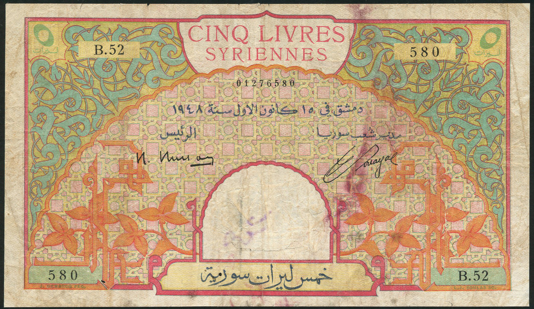 Banque de Syrie et du Liban, 5 Livres, 1948, zero serial number B.52 580, Busson and Souayal signatures, blue-green, pink and orange on yellow underprint, ornate scrollwork at upper left and right, stylised flowers at lower left and right, reverse Azem Palace in rectangular frame at centre