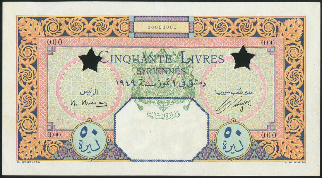 (x) Banque de Syrie et du Liban, specimen 50 livres, 1949, zero serial number, orange and multicolour, ornate designs and borders, Busson signature at left, arms at centre, reverse, house and gardens at centre, value in each corner