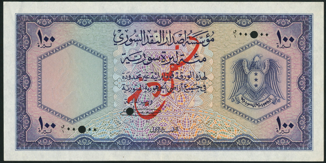 Institut d'Emission de Syrie, Syria, specimen 100 Livres, ND (1950s), serial number F/1 000000, dark blue on multicoloured, coat of arms at right, value in each corner, reverse Norias of Hama on the Orontes River, overprinted SPECIMEN in red in Arabic on obverse and in English on reverse, three punch holes