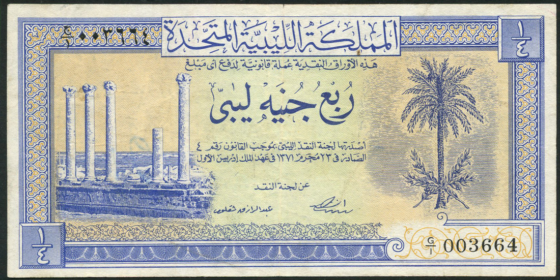 United Kingdom of Libya, 5 piastres, 1951, serial number L/5 698222, 10 piastres, 1951, serial number K/14 940544, 1/4 pound, 1951, serial number G/1 003664, red, olive green and blue respectively, all feature palm tree and olive branches at right, reverses, guilloche patterns