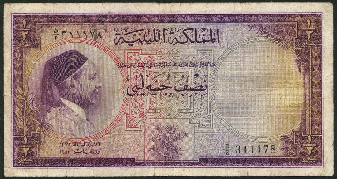 Kingdom of Libya, 5 piastres, 1952, serial number K/4 696856, 1/4 pound, 1952, serial number F/1 160832, 1/2 pound, 1952, serial number D/2 311178, all feature portrait of King Mohamed Idris at left, reverses, guilloche patterns