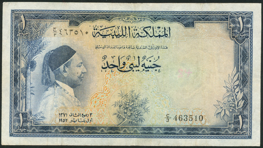 Kingdom of Libya, 1/2 pound, 1 January 1952, serial number D/1 349859 purple on multicoloured, 1 pound, 1 January 1952, serial number C/3 463510, blue on multicoloured, both with King Idris at left,