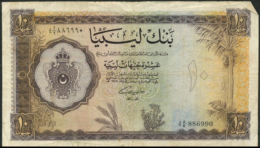 Bank of Libya, a full set from the 1963 first issue, £1/4, £1/2, £1, £5, £10, all with coat of arms at left, what and jolbann plant low centre, Khalil Al Bennani signature and a £1 from the 1962 issue