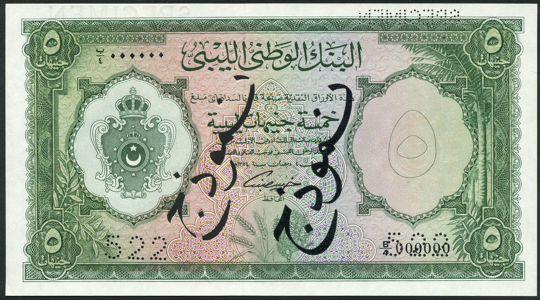 National Bank of Libya, £L5, 1955, serial number B/4 000000, green on multicolour, coat of arms at left, wheat and jolbann plant at low centre, perforated SPECIMEN and black overprint in Arabic